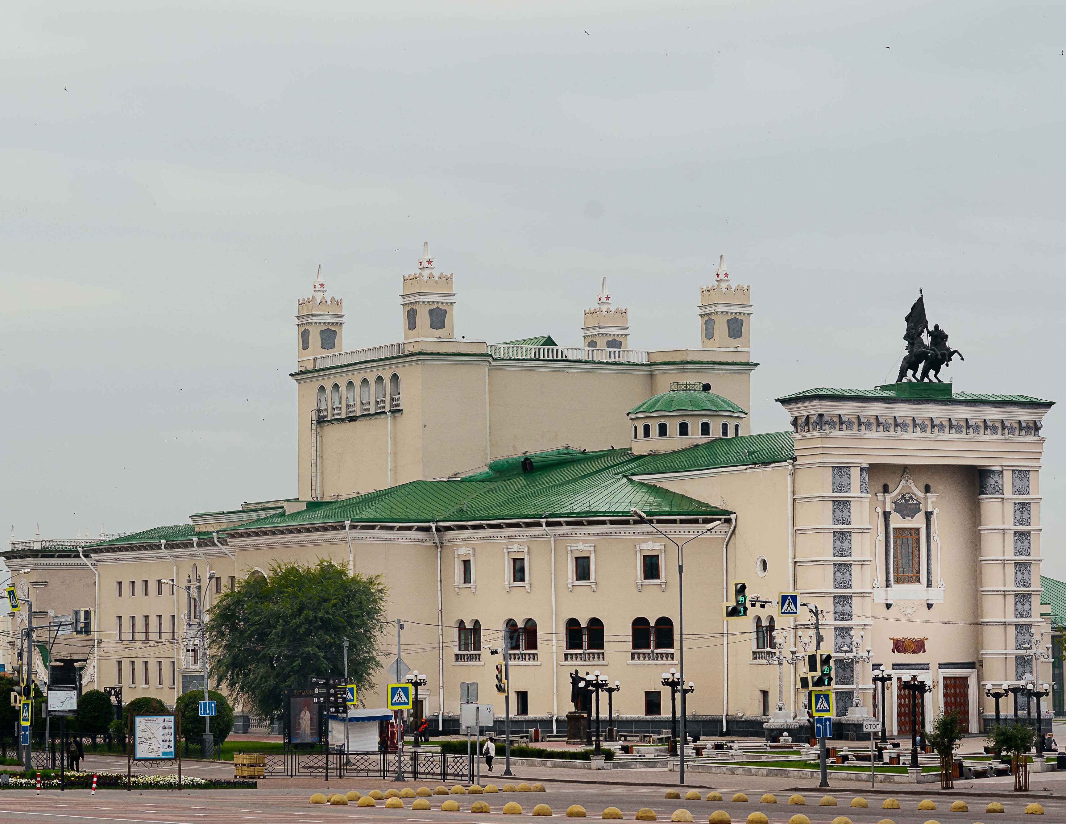 Неизменный интерес у гостей города вызывают живописный плафон зрительного зала работы художников Георгия Рублёва и Бориса Иорданского и скульптурная группа «Всадники» скульптора А. И. Тимона, расположенная над центральным порталом. Архитектура театра представляет собой удачный пример использования элементов национального бурятского убранства на общественных зданиях.