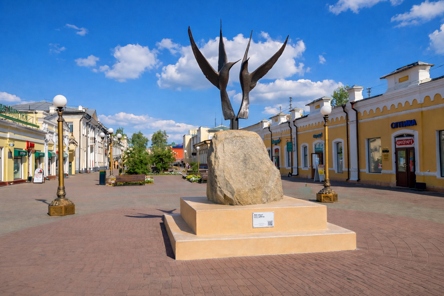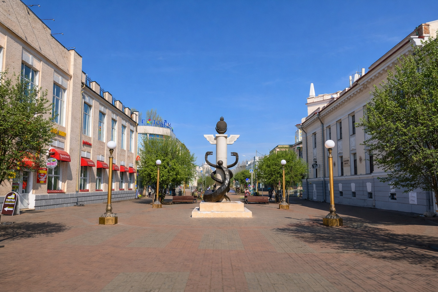 Далее начинается пешеходная часть улицы Ленина. Здесь установлена скульптурная композиция, изображающая герб города, — жезл Меркурия и рог изобилия. Композиция символизирует славное торговое прошлое города и его важную роль в установлении дипломатических отношений с соседними странами. На левой стороне улицы стоит дом с атлантами — это дом мещанина Нафтолия Леонтьевича Капельмана, одно из наиболее интересных жилых зданий дореволюционной постройки. Неподалёку, в доме купца Ивана Флегонтовича Голдобина, расположен Музей истории города. На противоположном краю Бурятского Арбата открывается вид на площадь Революции. Прежнее её название — Гостинодворская площадь — связано со строительством здесь в XIX веке Гостиных рядов, которые и сегодня используются по своему прямому назначению, оставаясь одним из наиболее ценных памятников истории города.