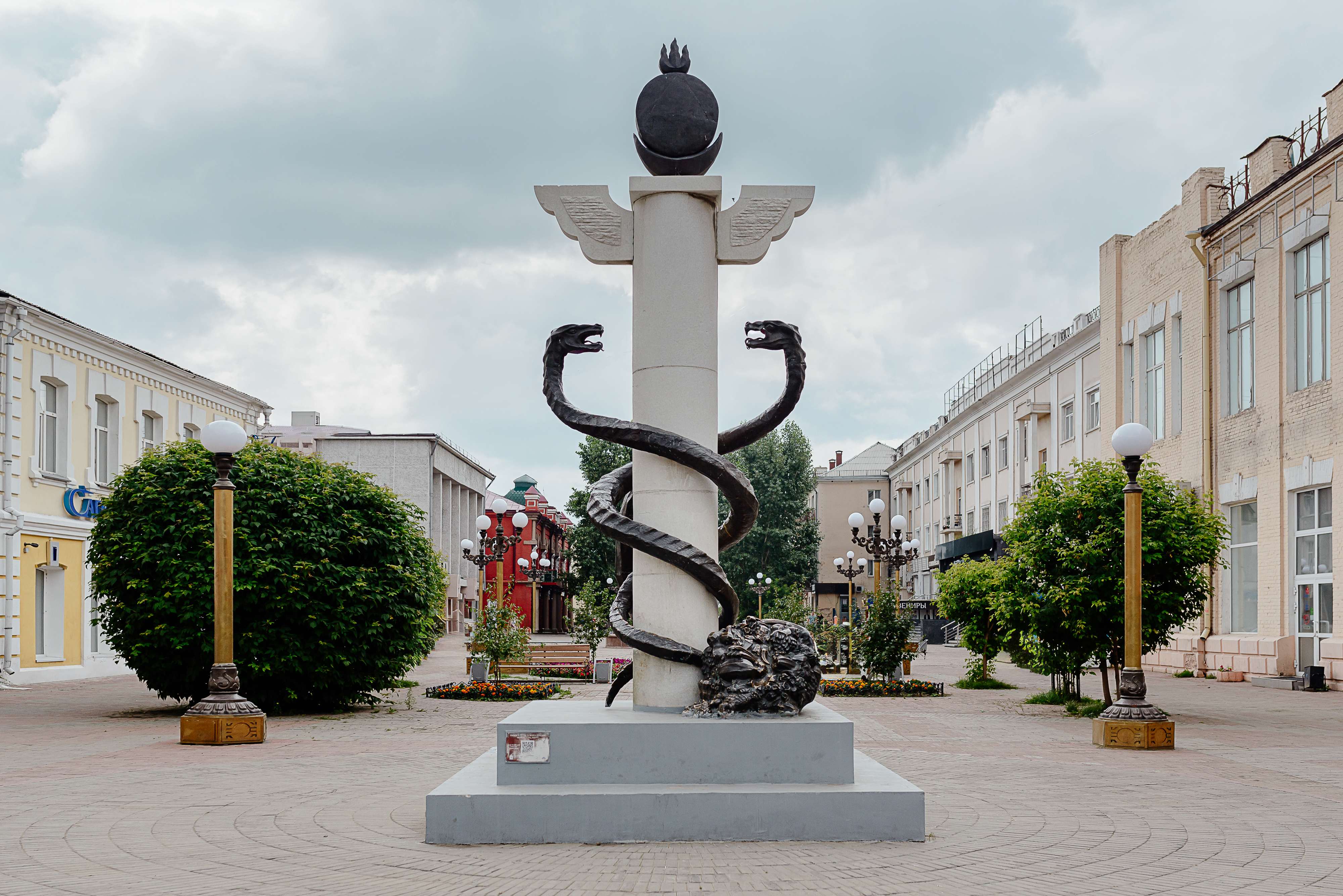 Авторы композиции — известные в республике скульптор Александр Миронов и архитектор Джейран Уланов. На каменном постаменте скульптуры размещен жезл бога торговли Меркурия в виде вертикального белого мраморного столба с крыльями наверху. Жезл обвивают бронзовые змеи.