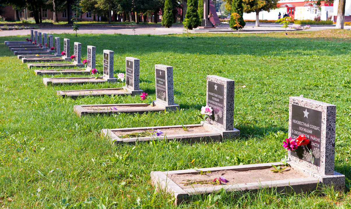 После войны сюда, в райцентр, в рамках кампании по укрупнению братских воинских захоронений, перезахоронили павших в боях из десятков деревень Ельнинского района.