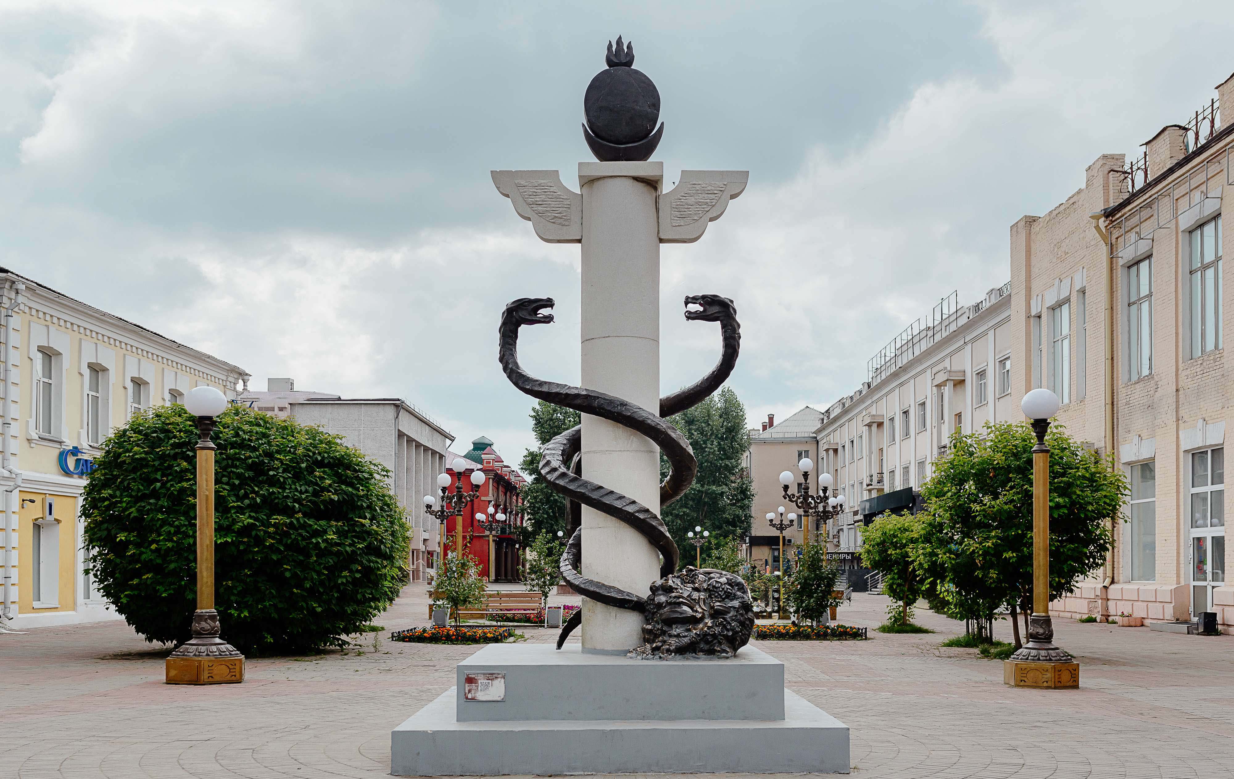 Скульптура «Жезл бога торговли Меркурия и рог изобилия» на эколого-краеведческой тропе «Мой любимый город». 2021