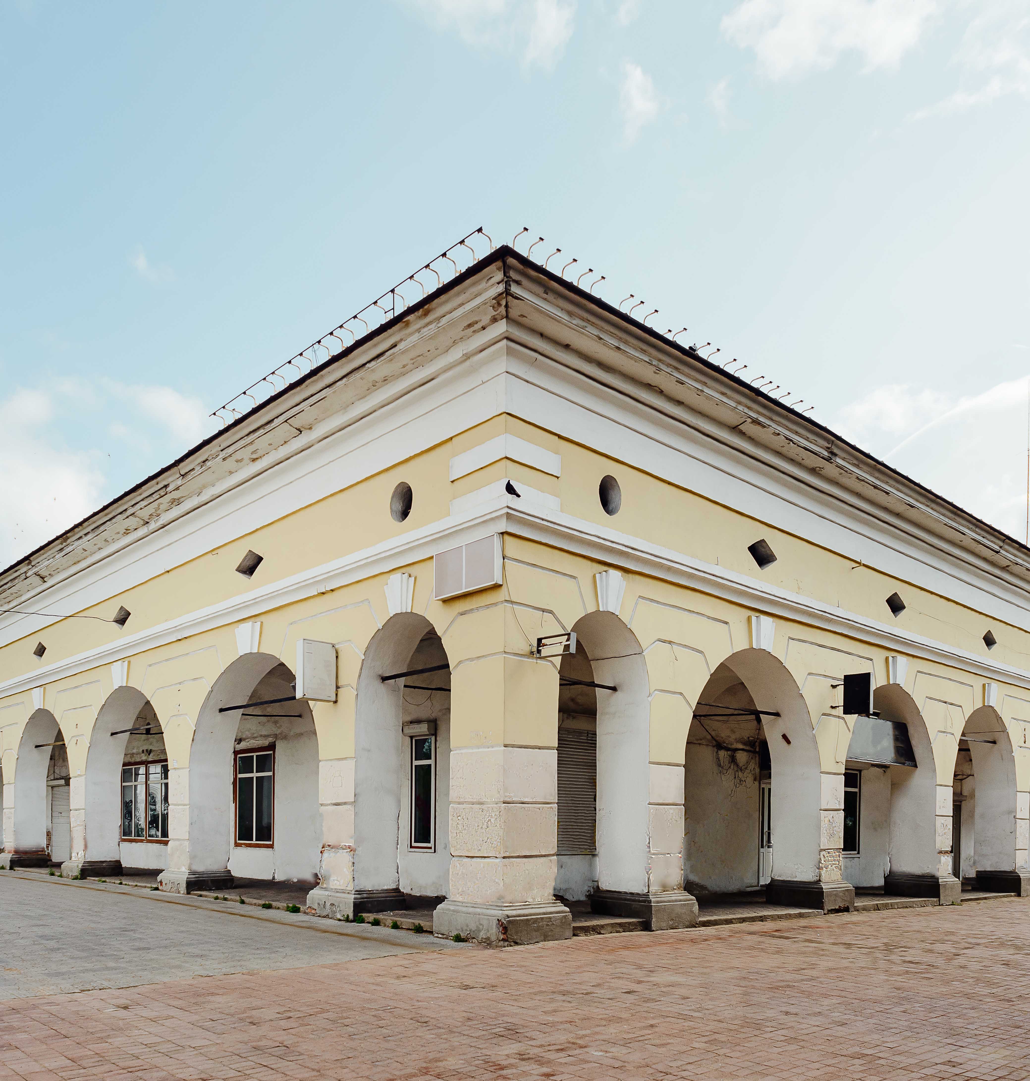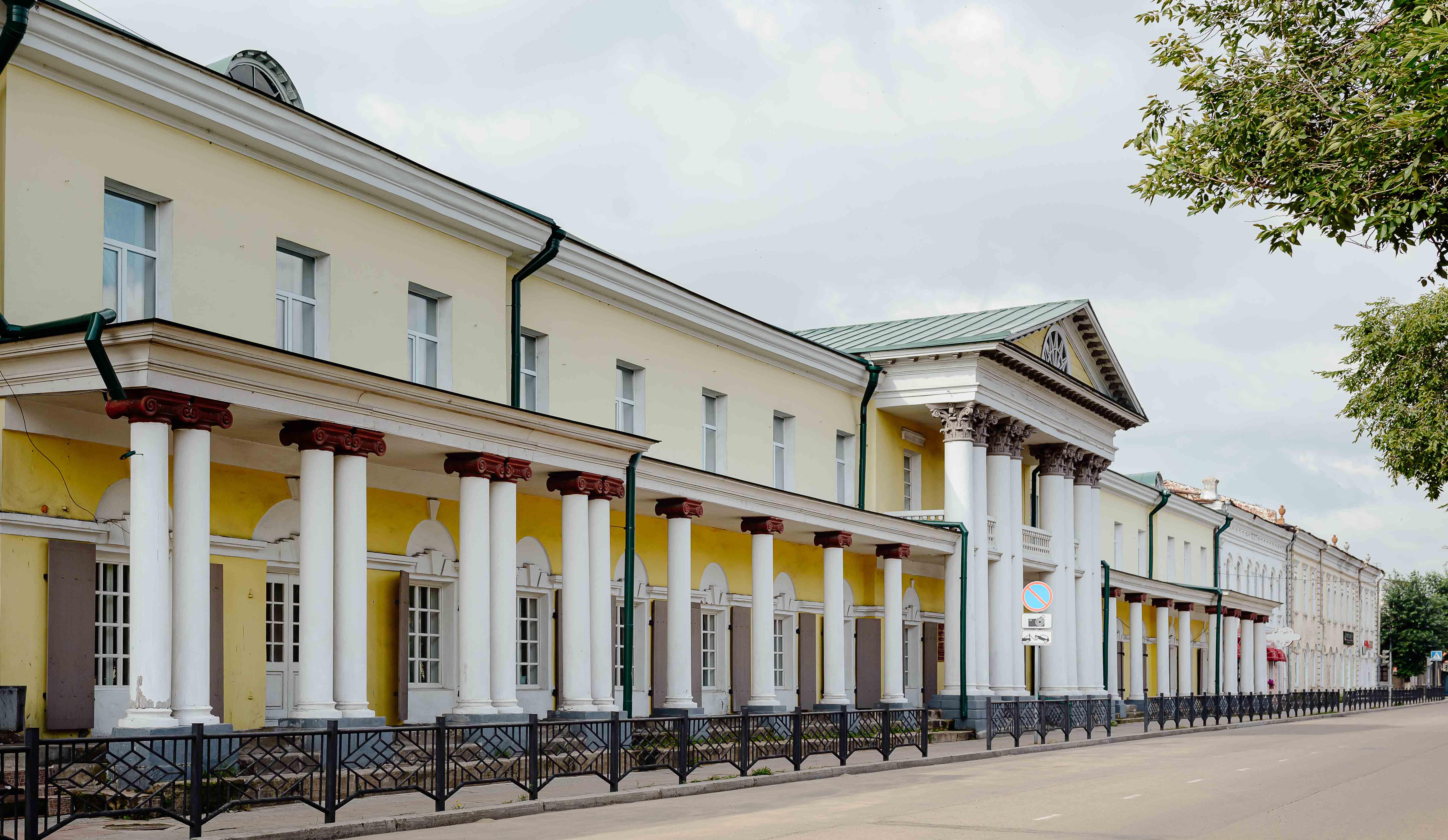 Всего внаём сдавалось 16 лавок. Вдоль торговых помещений проходит живописная крытая галерея. Её своды поддерживаются колоннами в ионическом стиле, сделанными из цельных лиственниц. То, что сегодня мы принимаем за вход в здание, на самом деле было арочным проёмом — въездом во двор.